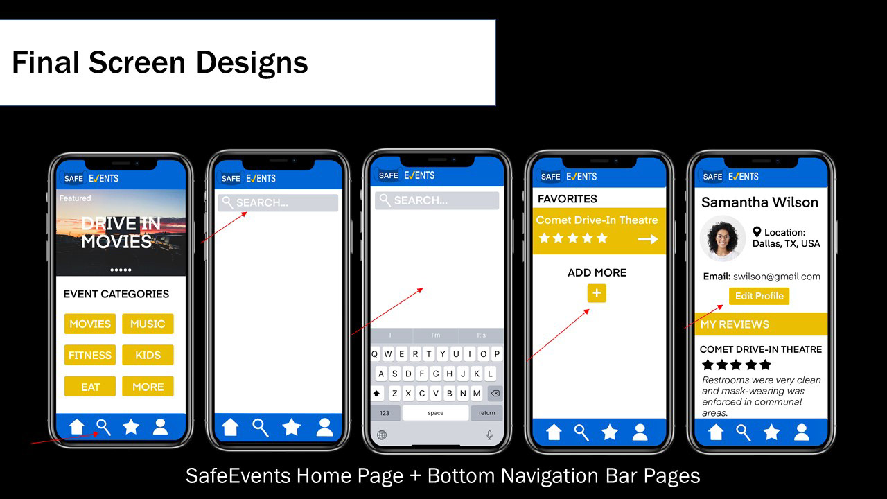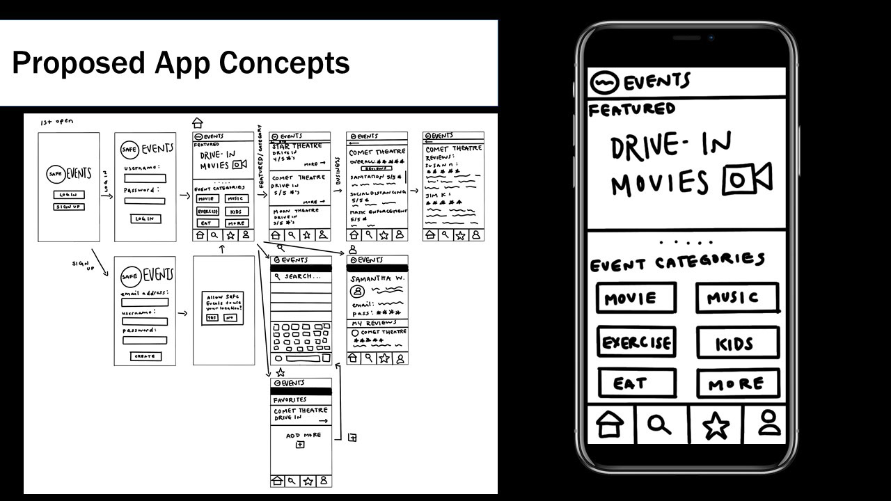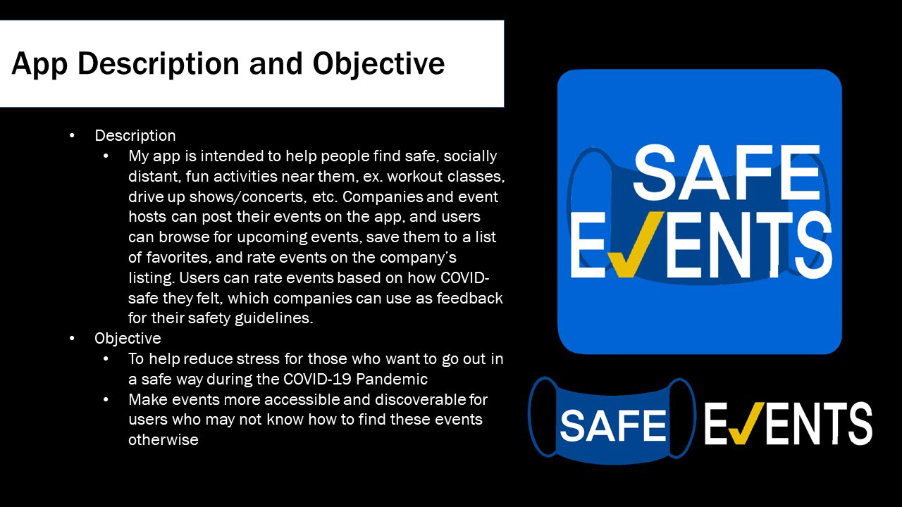 SafeEvents is a fictional mobile application intended to help people find safe, socially distant, fun activities near them, ex. workout classes, drive up shows/concerts, etc. Companies and event hosts would post their events on the app, and users can browse for upcoming events, save them to a list of favorites, and rate/read reviews of events on the company’s listing. Users can rate events based on how COVID-safe they felt, which companies can use as feedback for their safety guidelines.