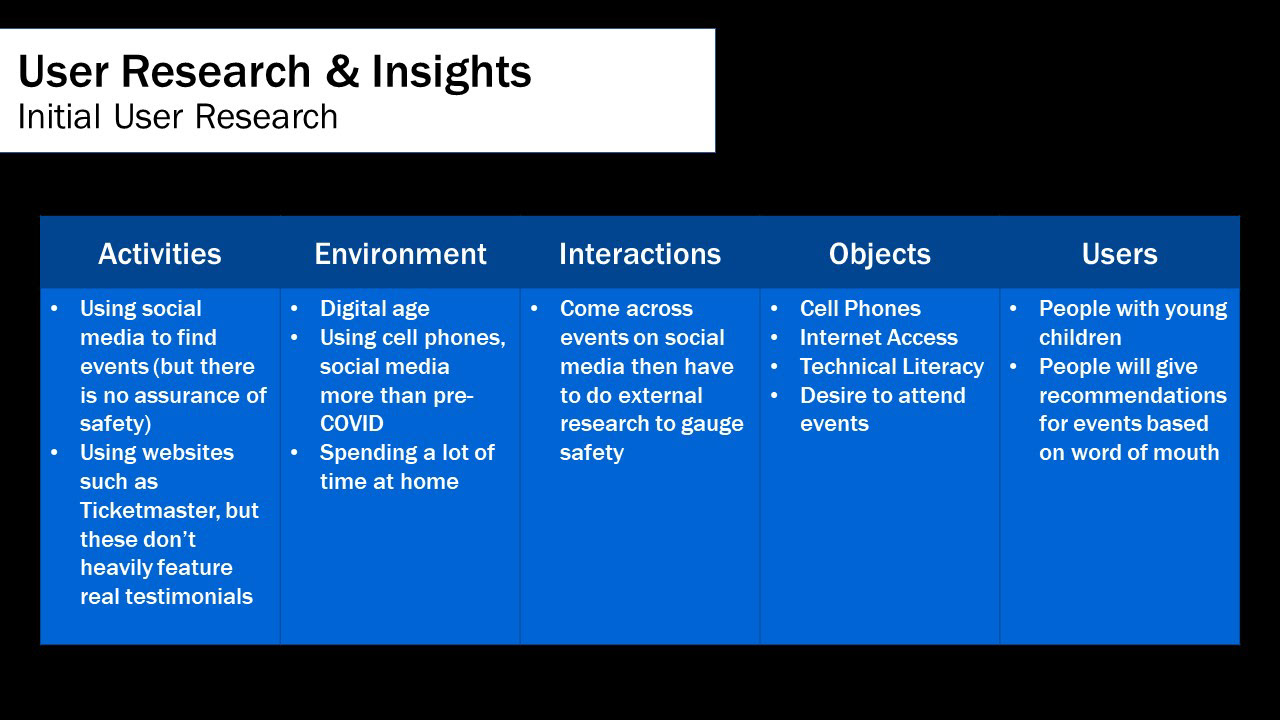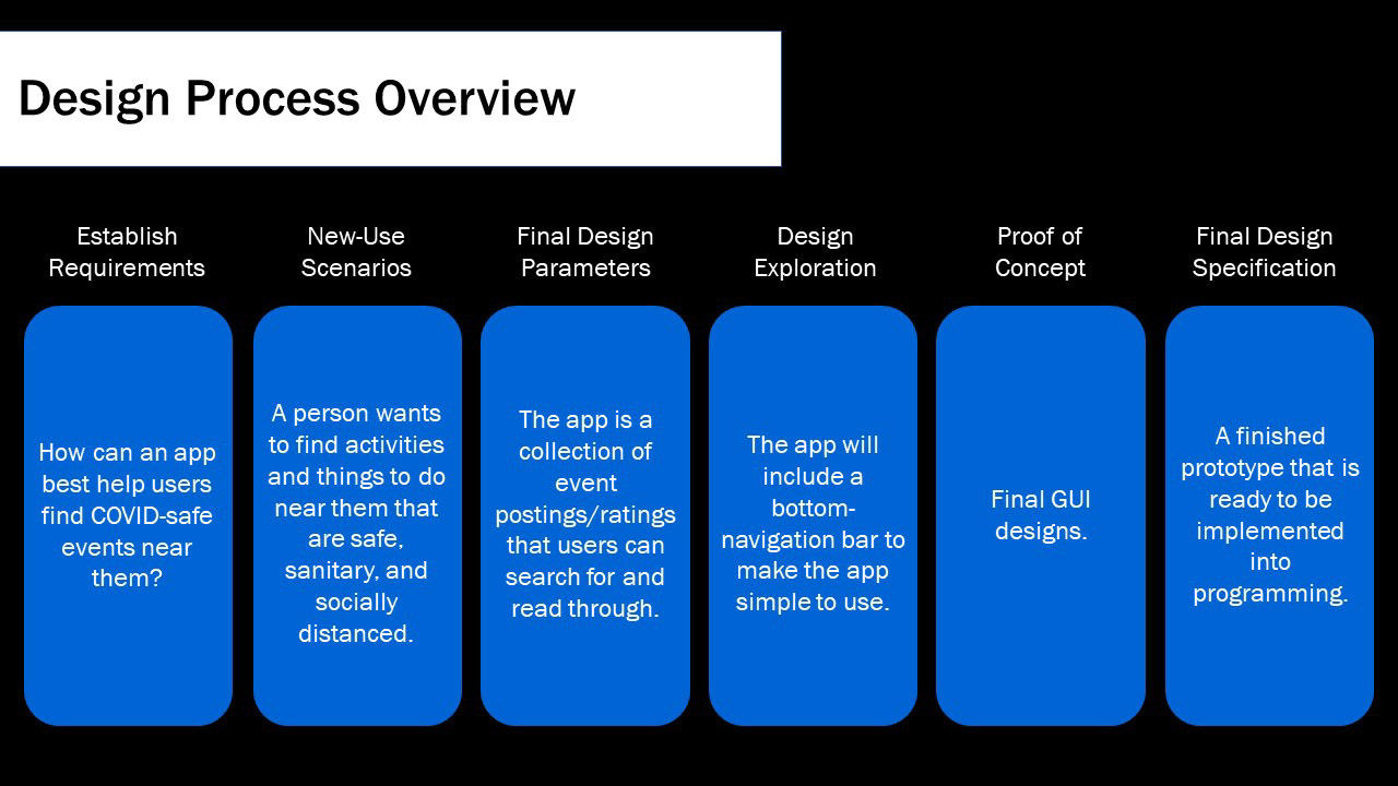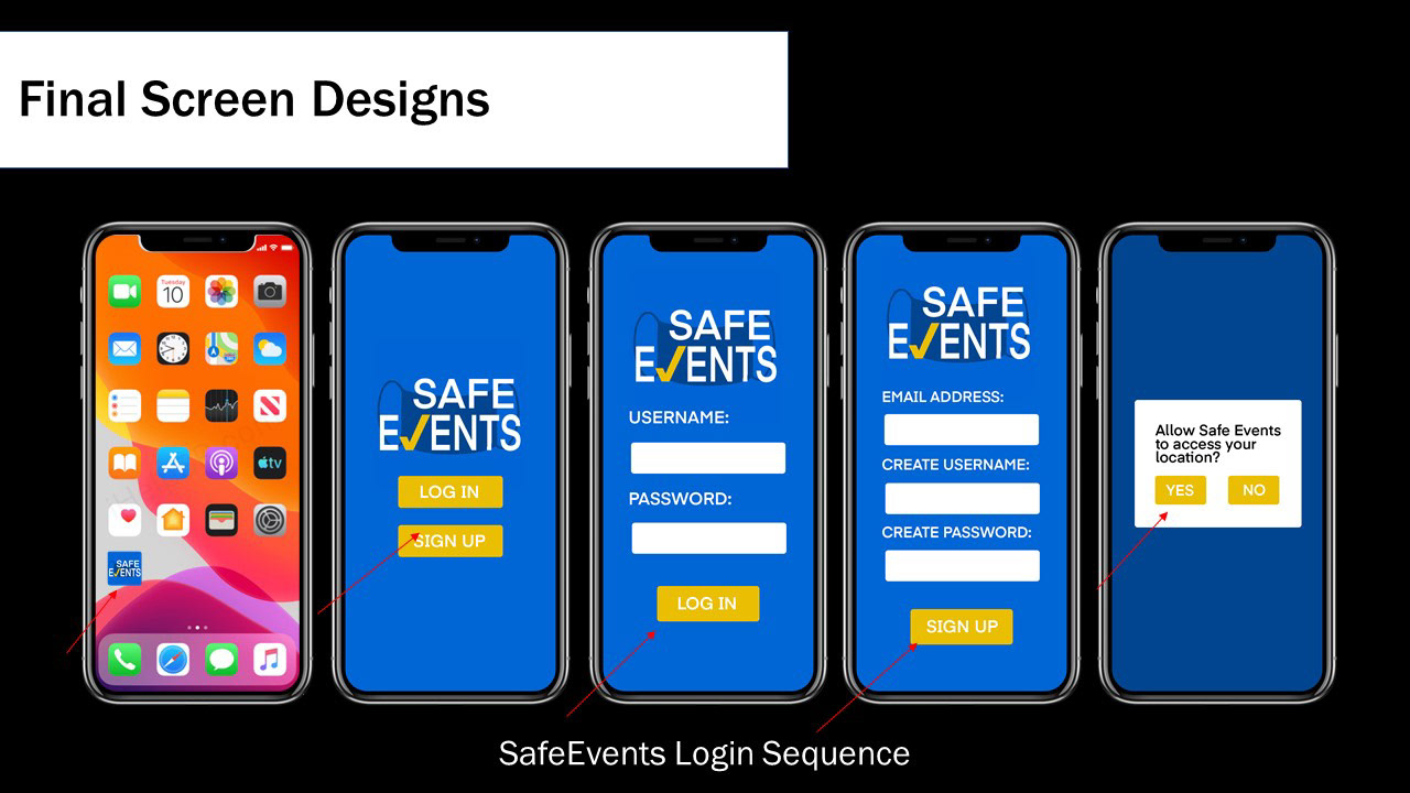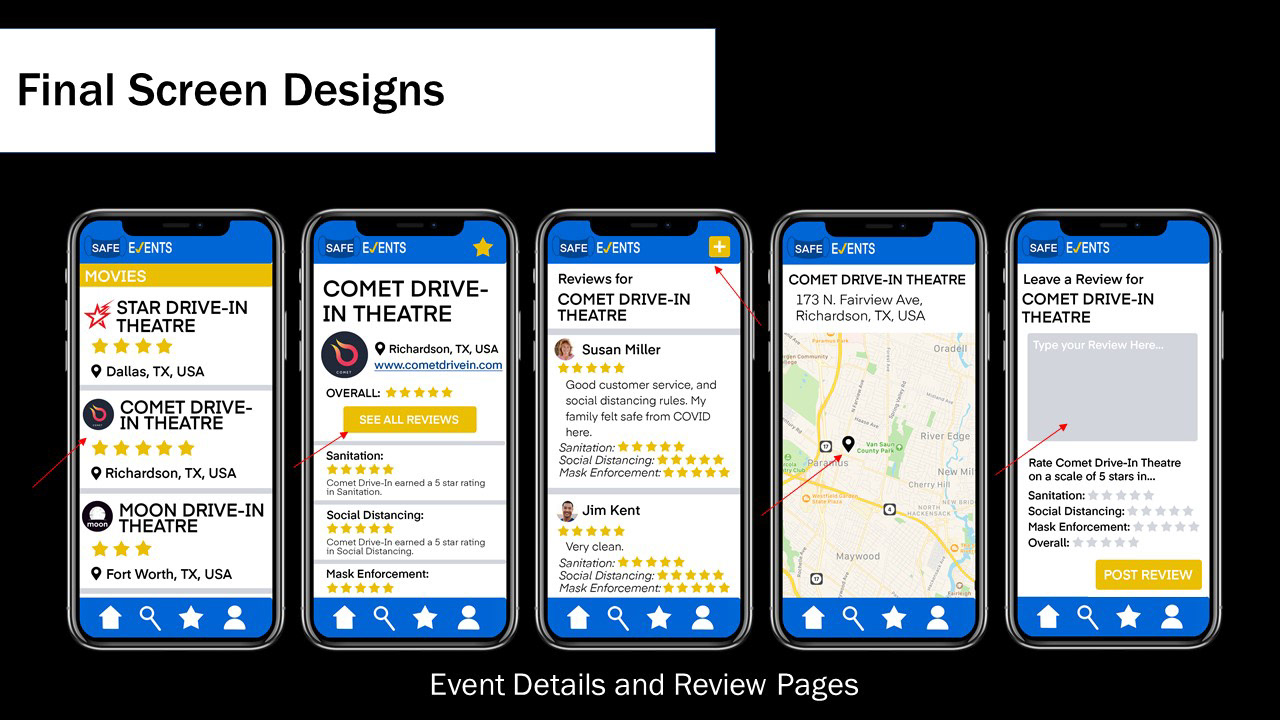 SafeEvents is a fictional mobile application intended to help people find safe, socially distant, fun activities near them, ex. workout classes, drive up shows/concerts, etc. Companies and event hosts would post their events on the app, and users can browse for upcoming events, save them to a list of favorites, and rate/read reviews of events on the company’s listing. Users can rate events based on how COVID-safe they felt, which companies can use as feedback for their safety guidelines.